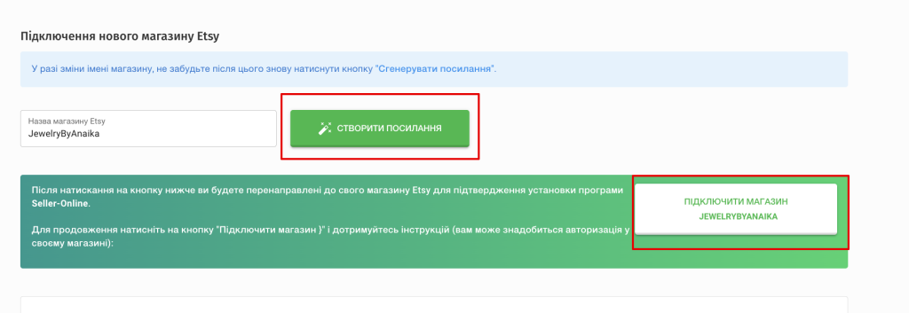 Крок перший: введіть назву Вашого магазину на Etsy та натисніть кнопку «Створити посилання».