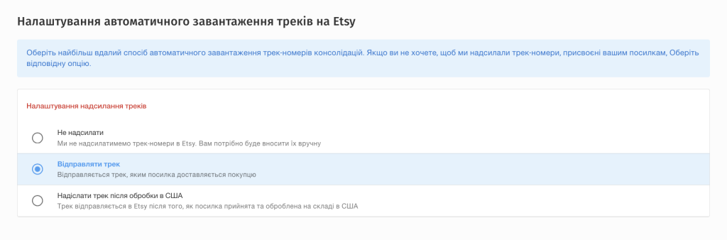 - відправляти трек: варіант, який працює зараз за замовчуванням. Додається трек кінцевого оператора доставки, який починає відстежуватися після обробки товару на складі в США.
