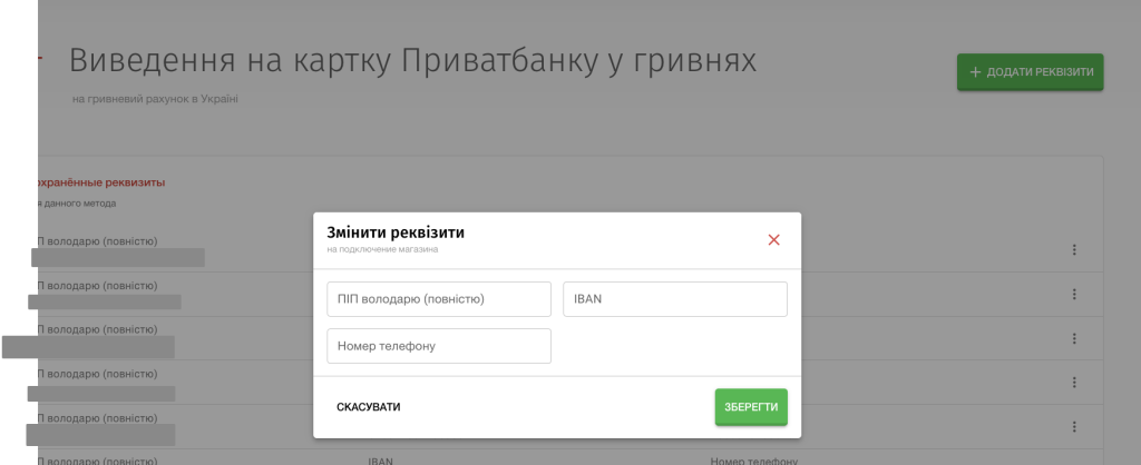 3. В таблиці «Доступні методи» обрати бажаний спосіб виведення. Якщо бажаний спосіб виведення неактивний, необхідно натиснути «Реквізити» та заповнити форму. Ви можете вказати реквізити для декількох карт і вибирати при виведенні необхідну.