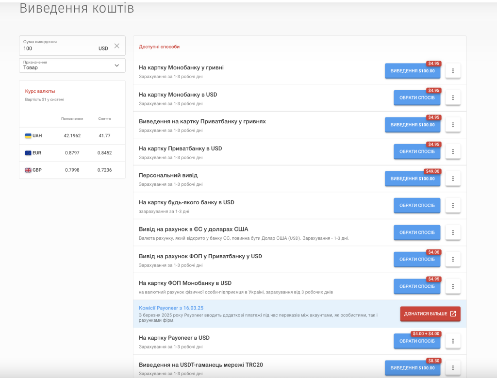 | Спосіб виведення | Комісія | Термін зарахування | Примітки |
